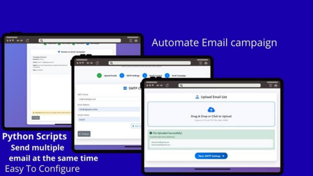 A lightweight Python + Flask app that automates email campaigns. Drag & drop your recipient CSV, enter SMTP settings, personalize templates with merge fields, and send batched, trackable emails from your own server — simple, fast, and private.